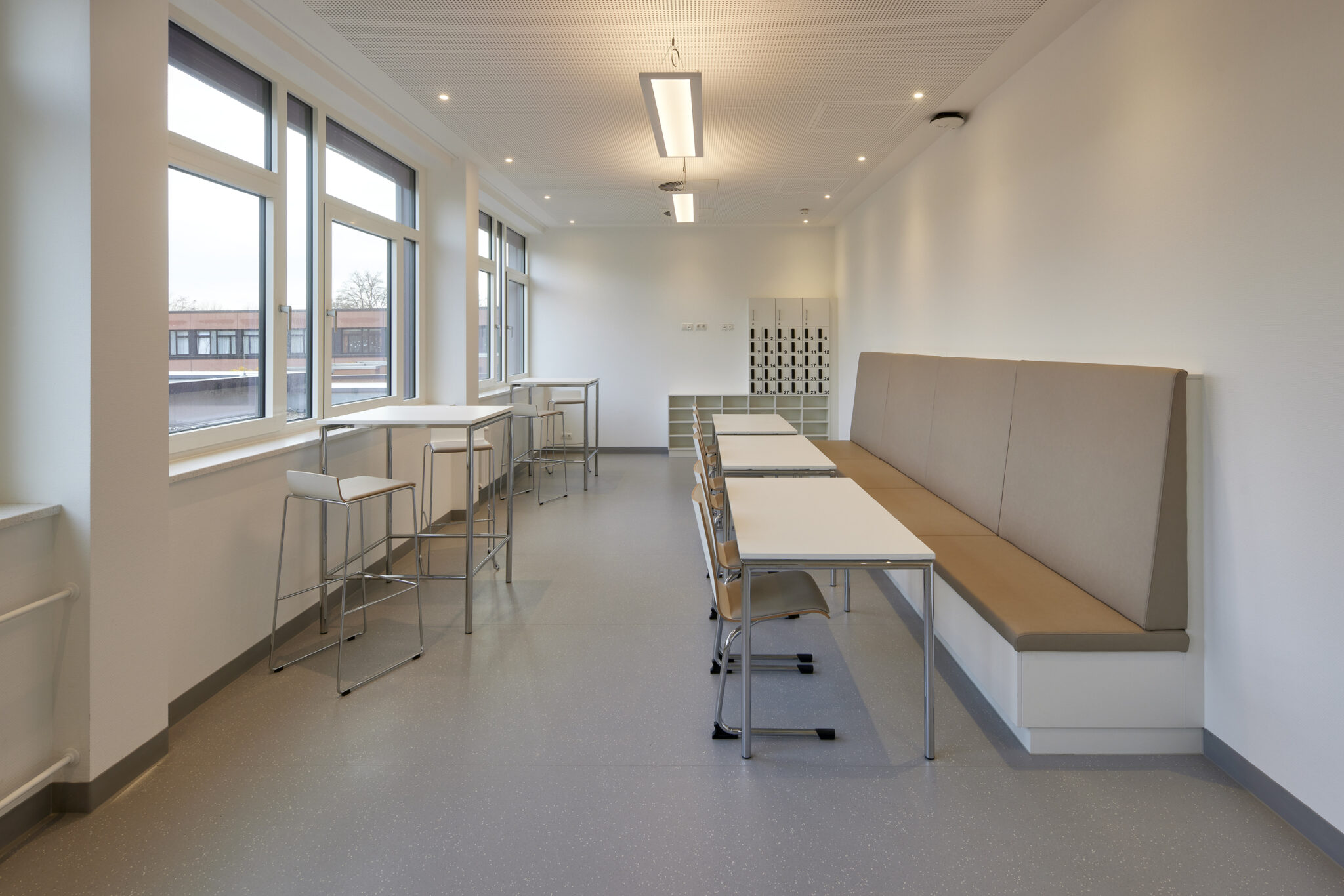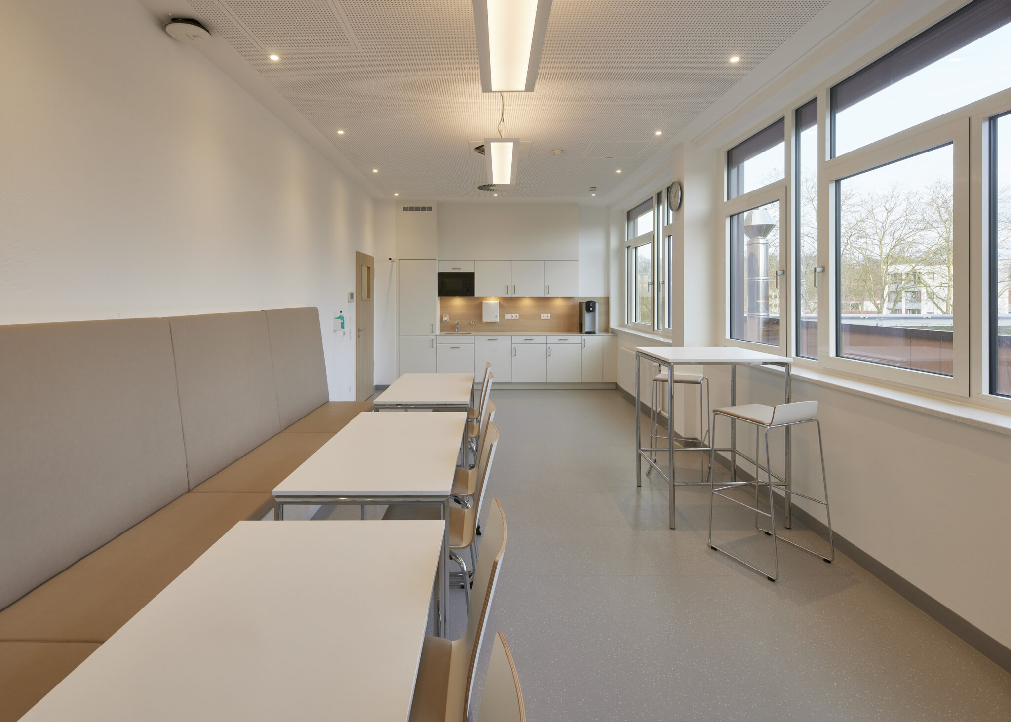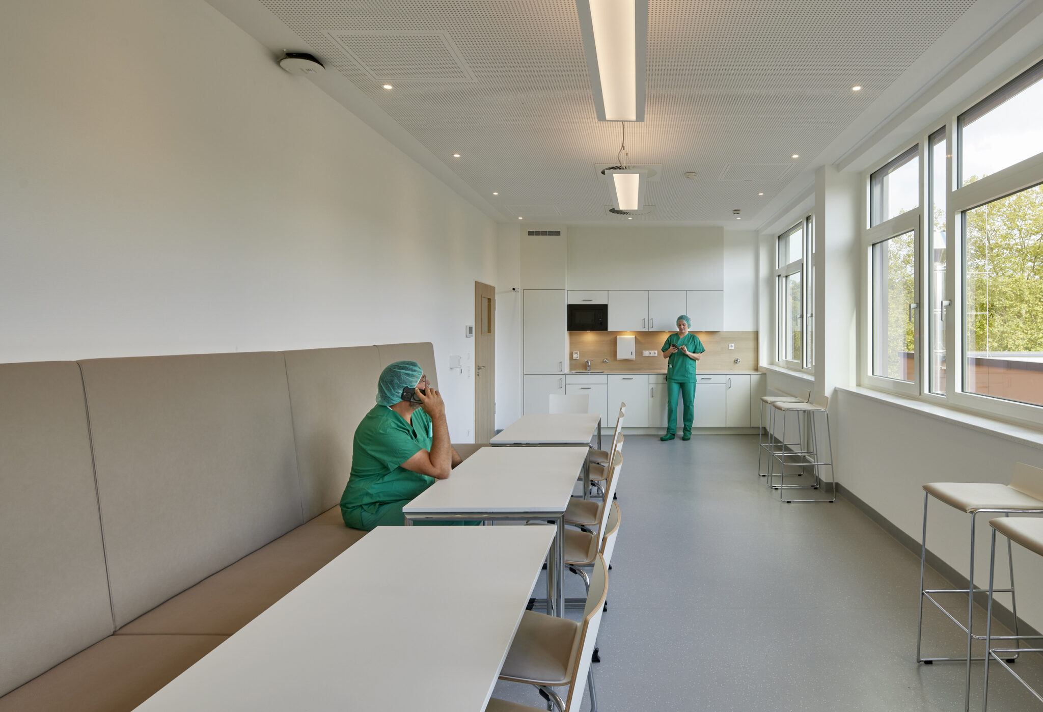 Der Aufenthaltsraum für OP-Mitarbeitende bietet einen Blick ins Grüne.