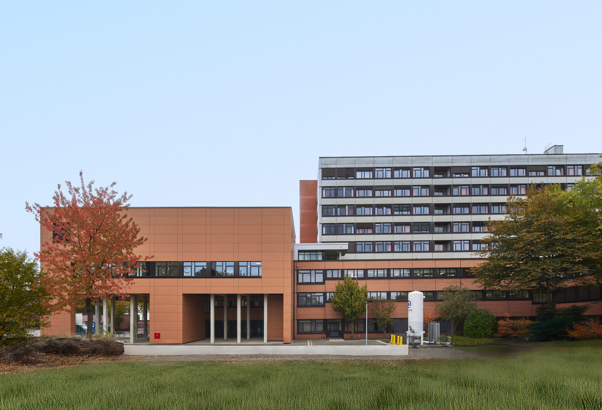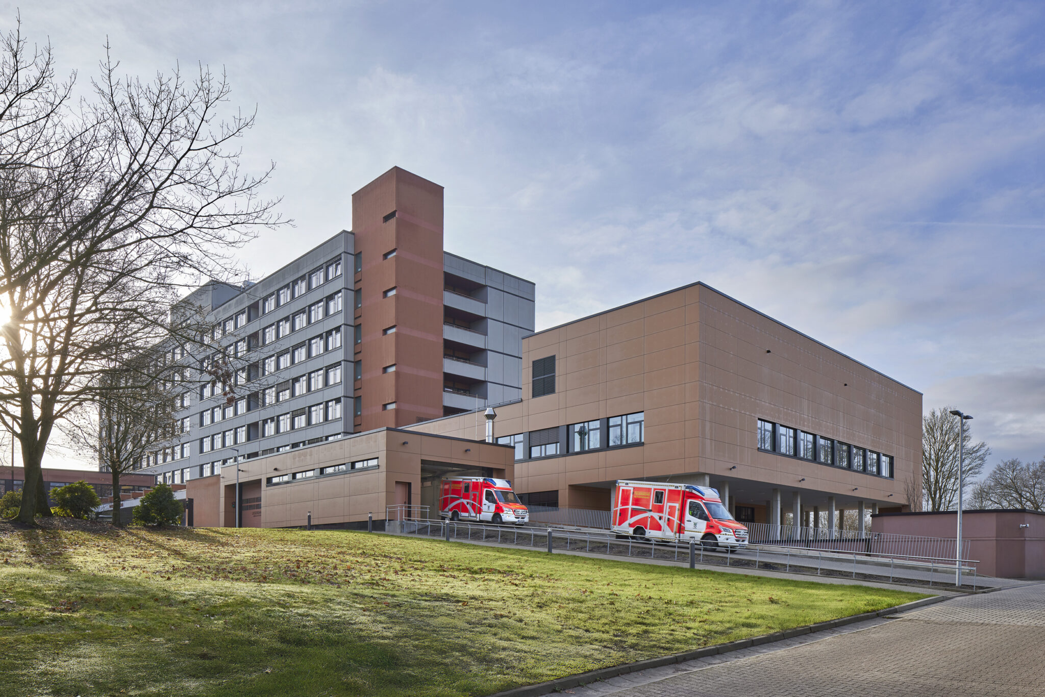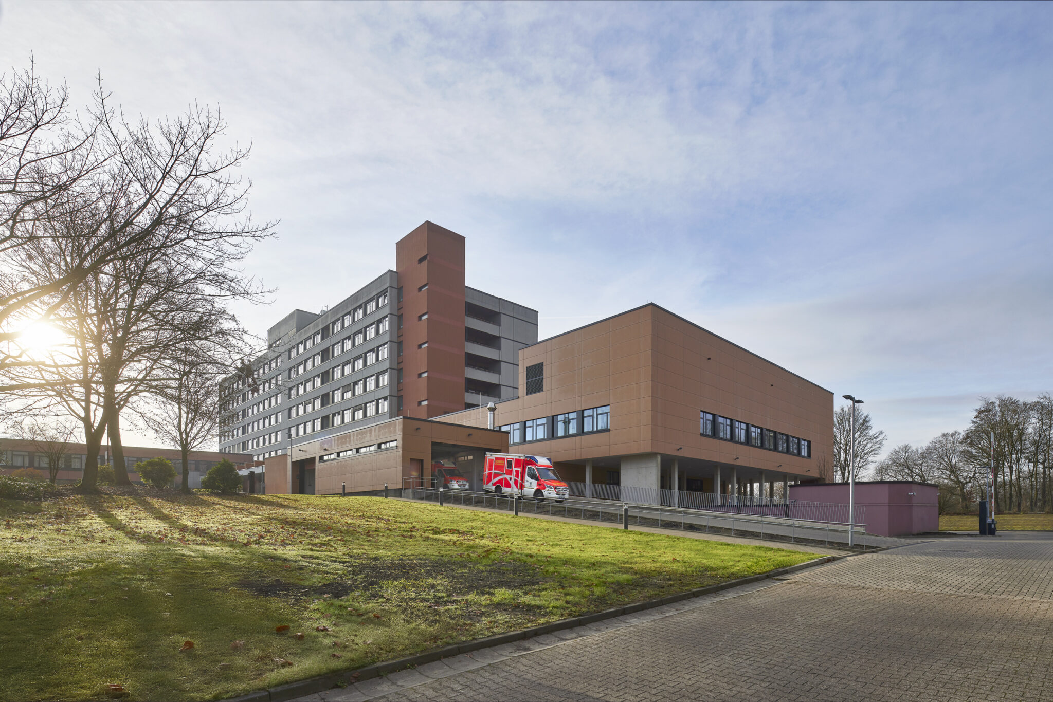 Blick auf den Erweiterungsbau mit vorgelagerter Liegendkrankenanfahrt.