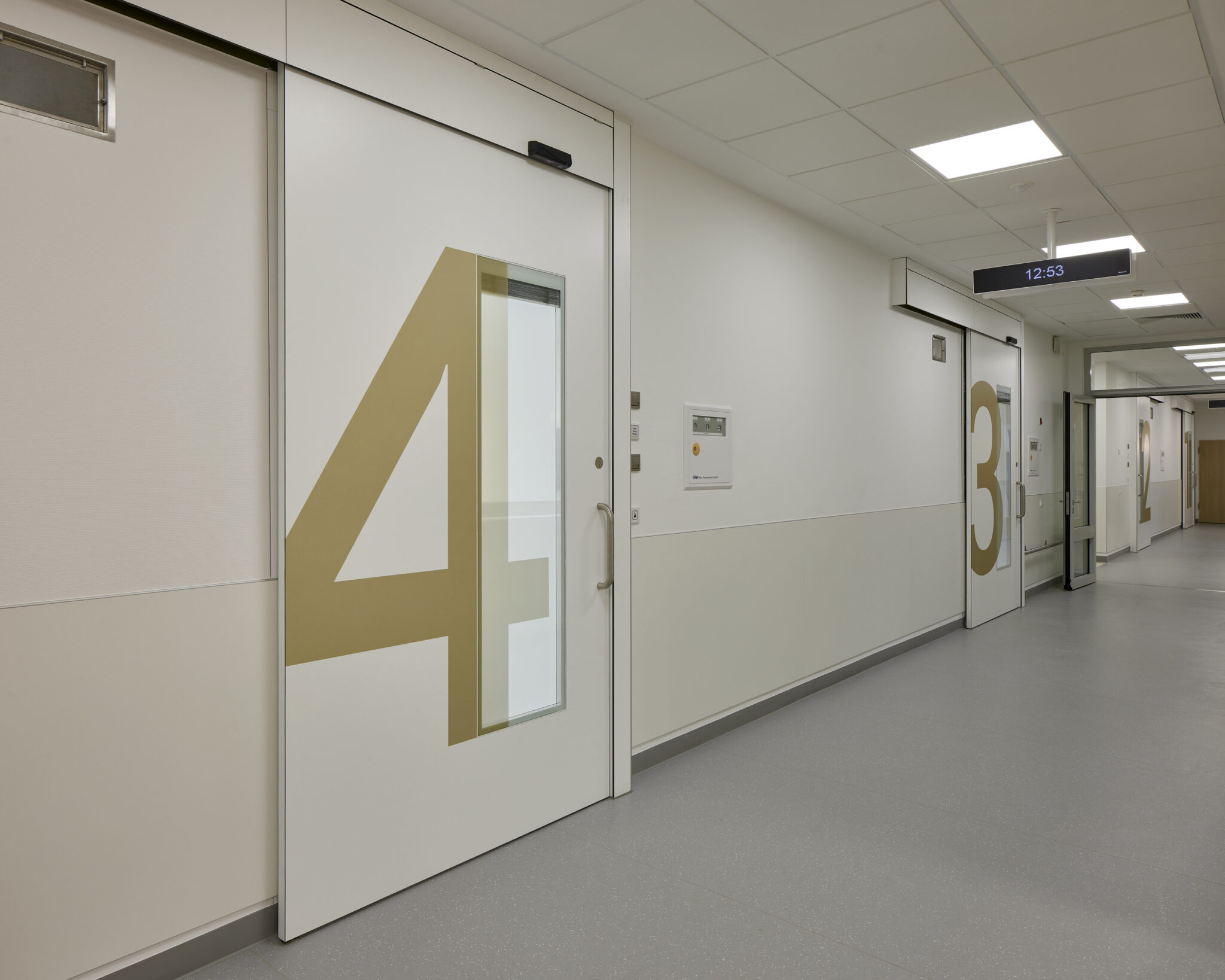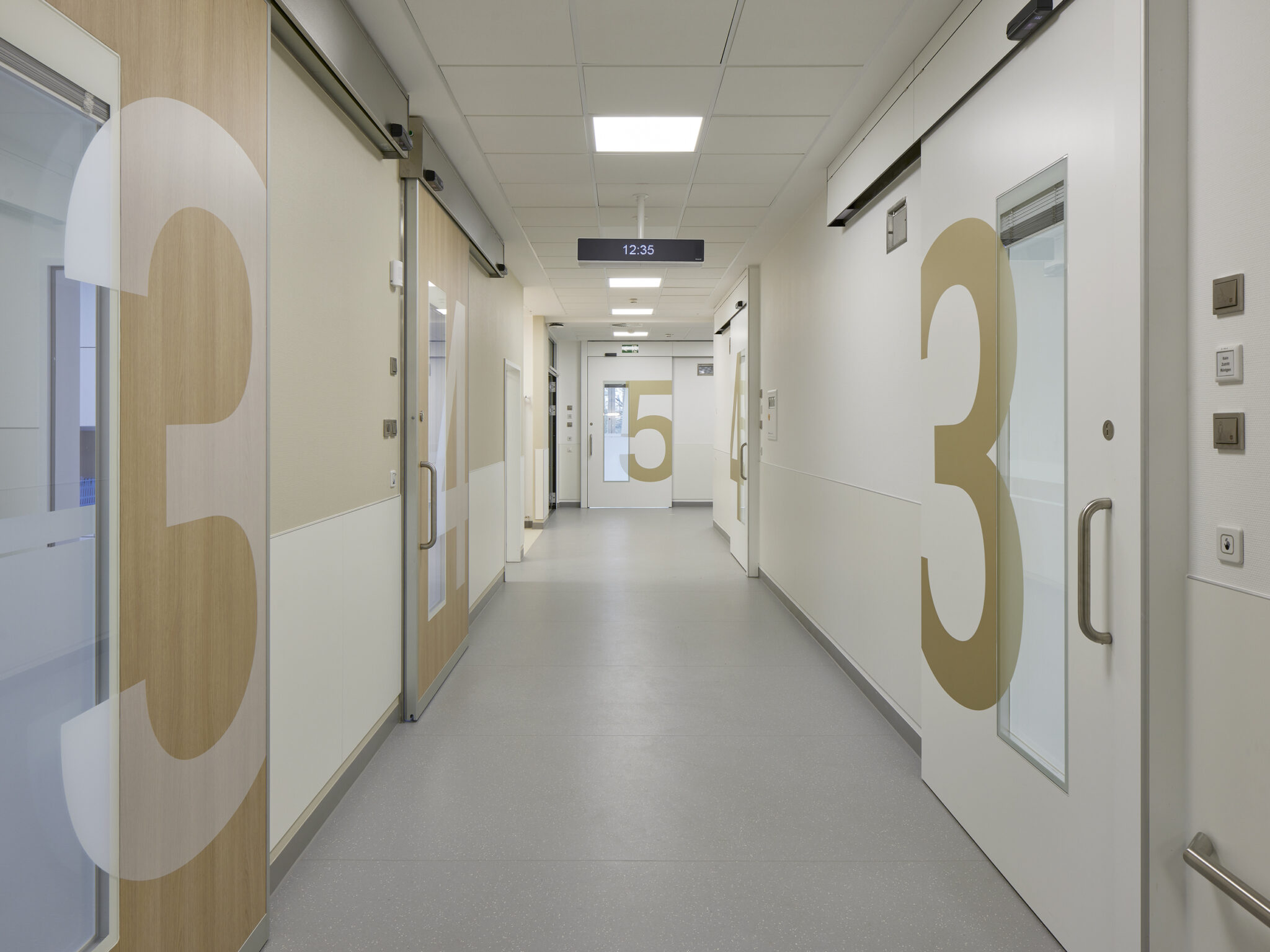 Großformatige Folierungen auf den OP- und Einleitungstüren sorgen für eine maximale Orientierung im neuen OP-Trakt. Die zentrale Einleitungszone befindet sich jeweils gegenüber der OP-Räume.