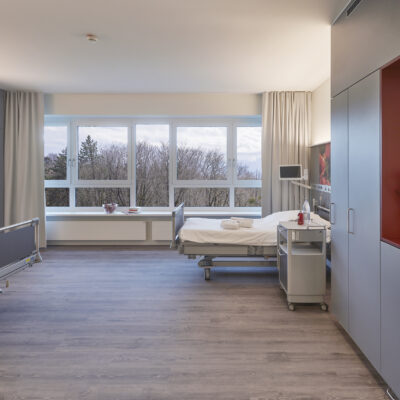 Die neugestalteten Patientenzimmer der Komfortstation verbinden moderne Funktionalität mit einer gehobenen, wohnlichen Hotelatmosphäre. Helle Farben und Holzdekore sorgen für eine beruhigende Umgebung, die zum Wohlfühlen einlädt.